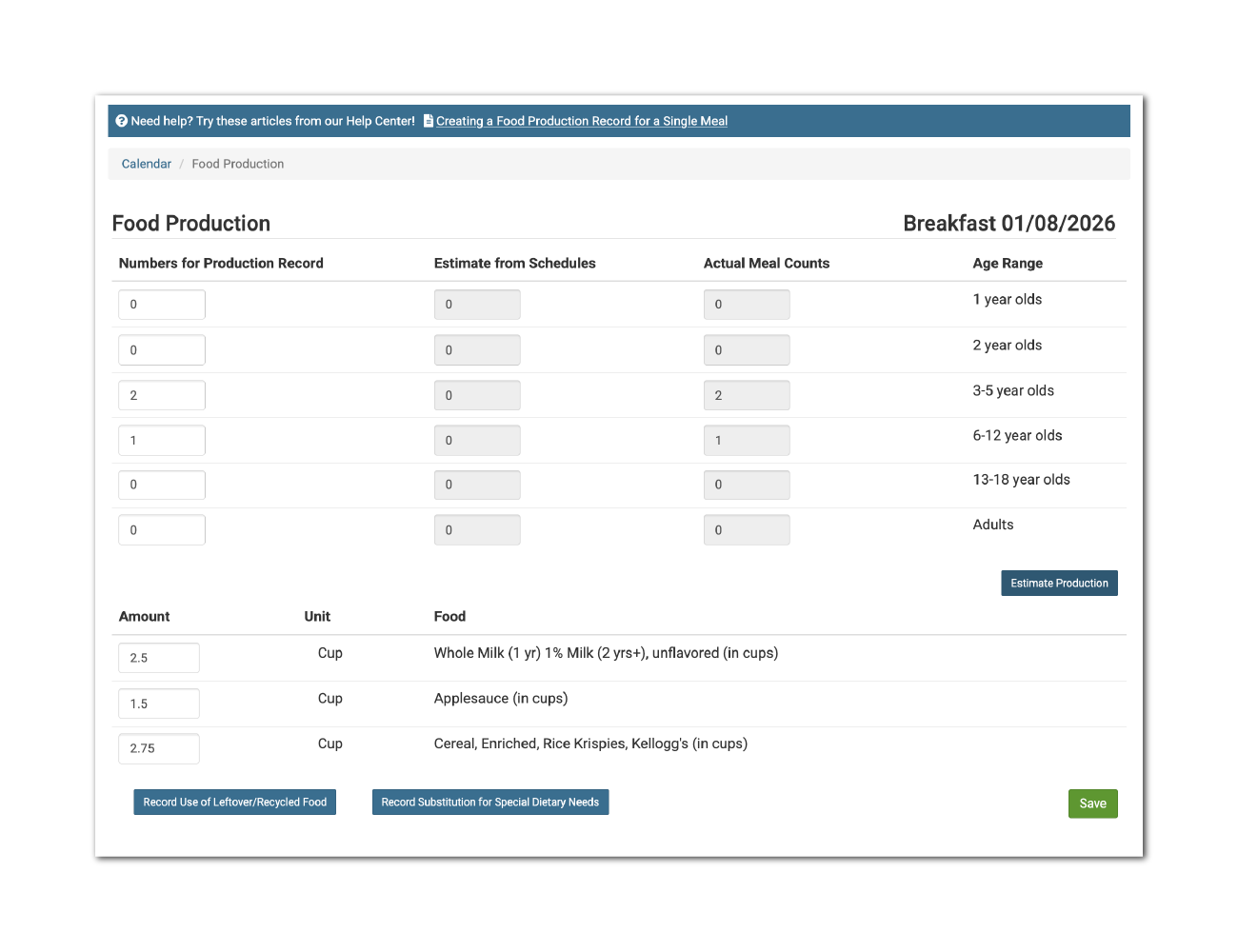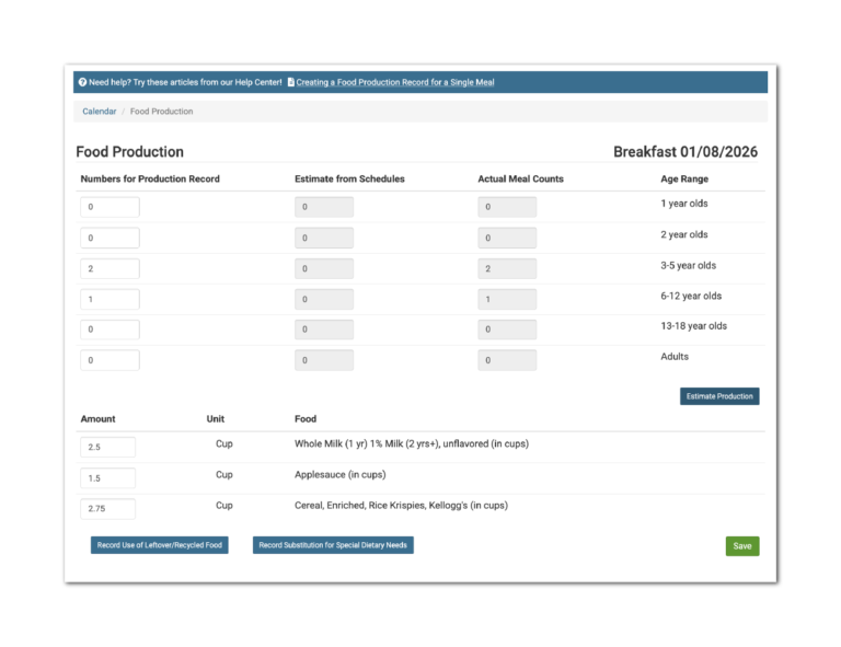 This report pulls all meal production records for each day onto one page. This report does not include substitutions for special dietary needs or a record of leftover/recycled food.