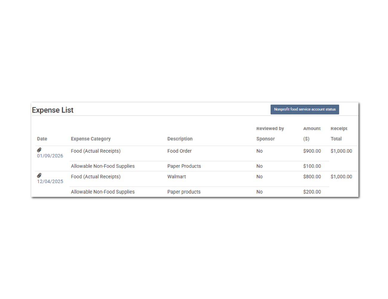 A list of the meals that were non-payable (over the daily claim limit) or disallowed for a calendar month. Includes the date, meal type, participant and the reason for the disallow.